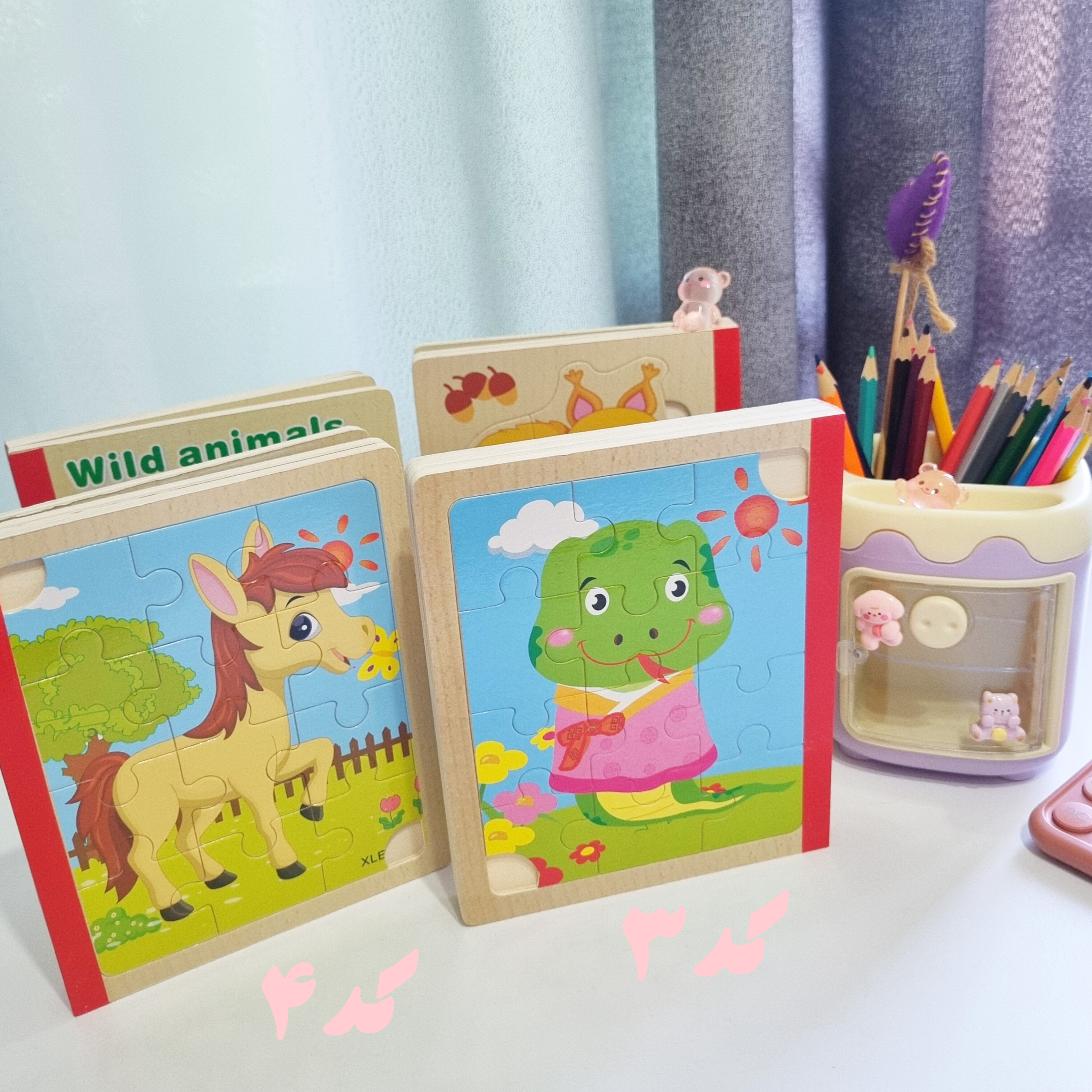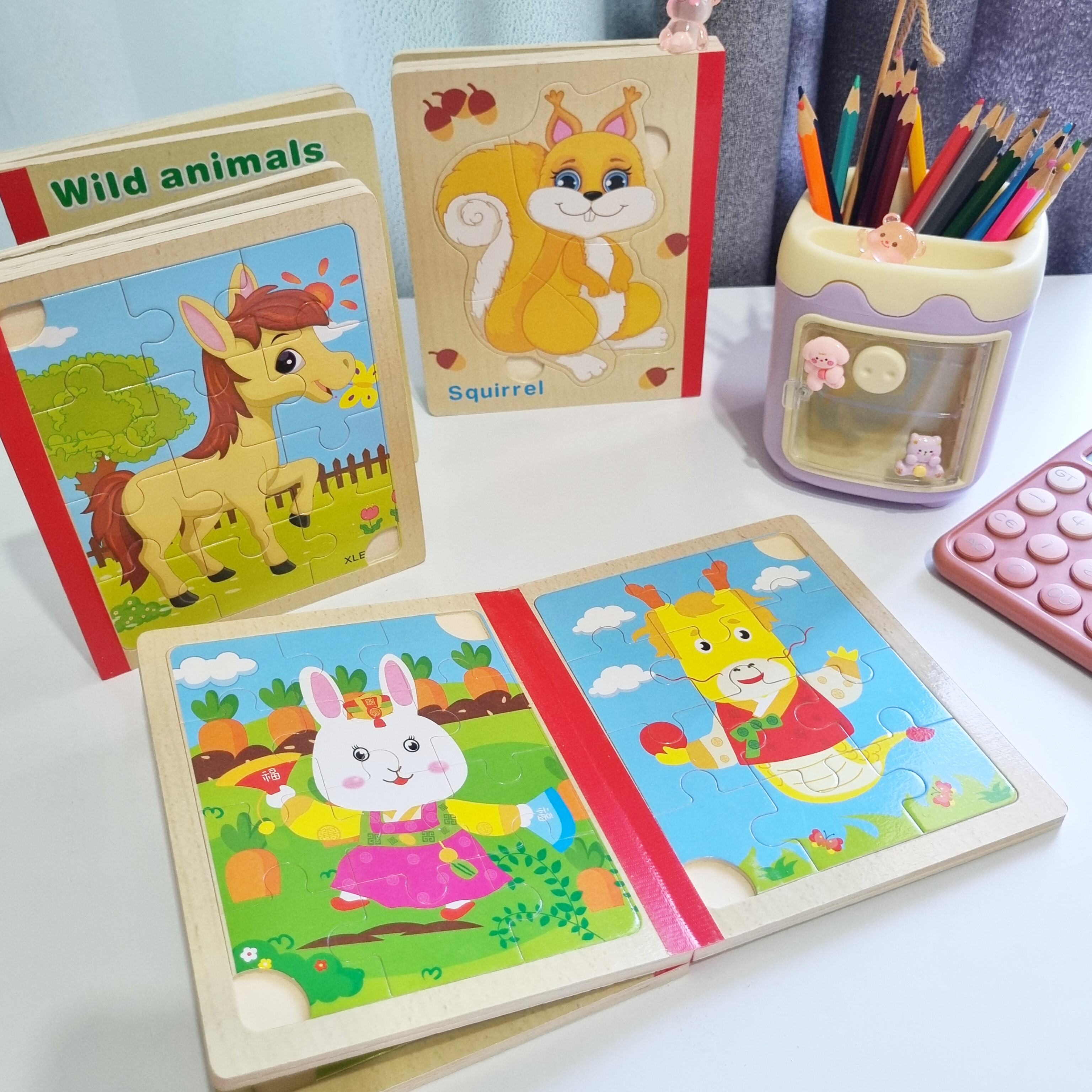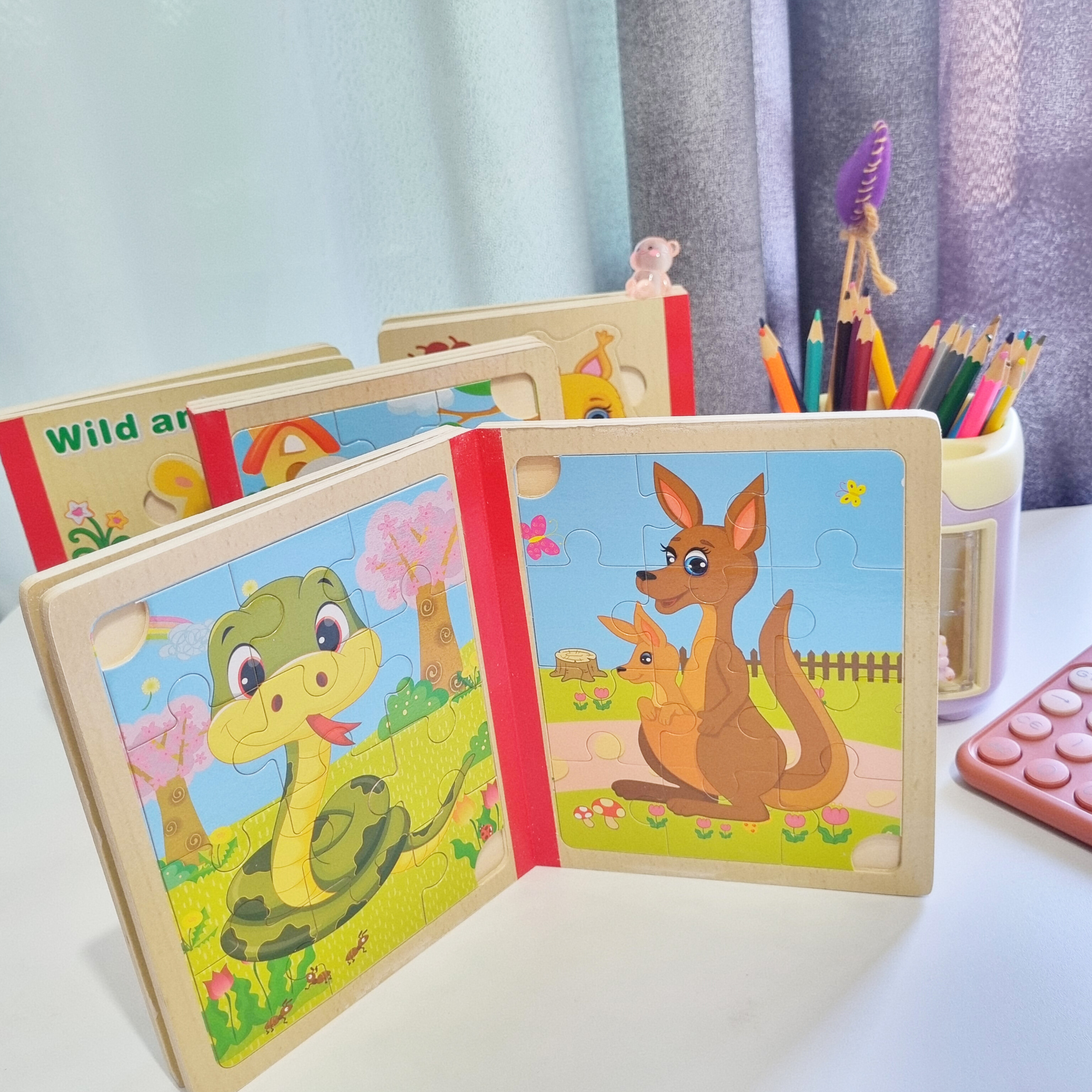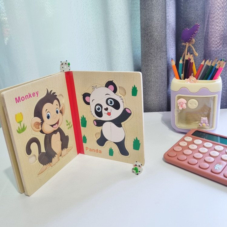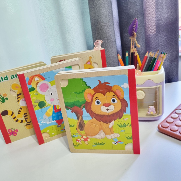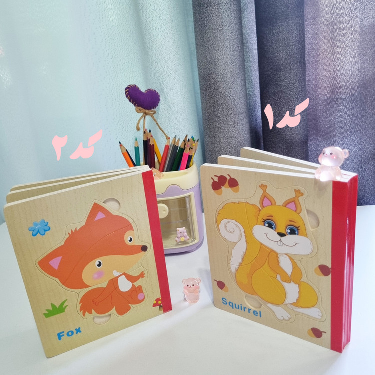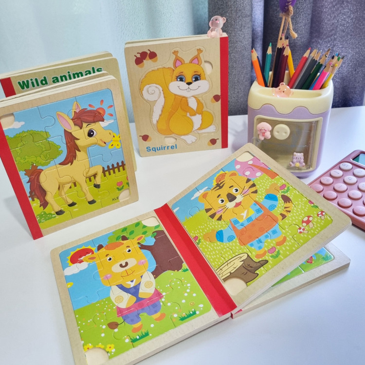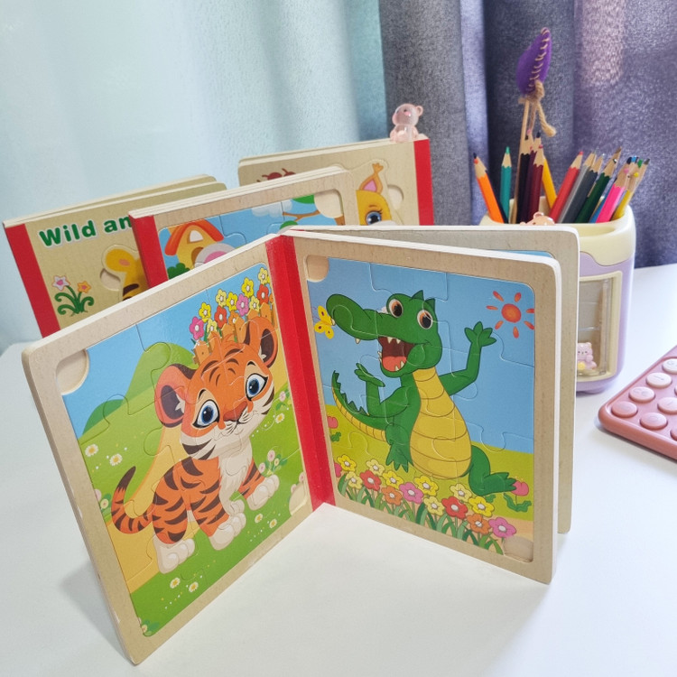 پازل چوبی کتابی از سه ورق چوبی است که جمعا 6 پازل را در خود جای داده است تشکیل شده است. کودک کتاب را ورق می زند قطعات پازل را کنار هم می چیند و از روی تصاویر شروع به داستان پردازی می کند. یکی از فواید حل کردن این پازل های تقویت مهارت حل مساله و پرورش خلاقیت در کودکان است . صفحات این کتاب ضخیم و مقاوم است