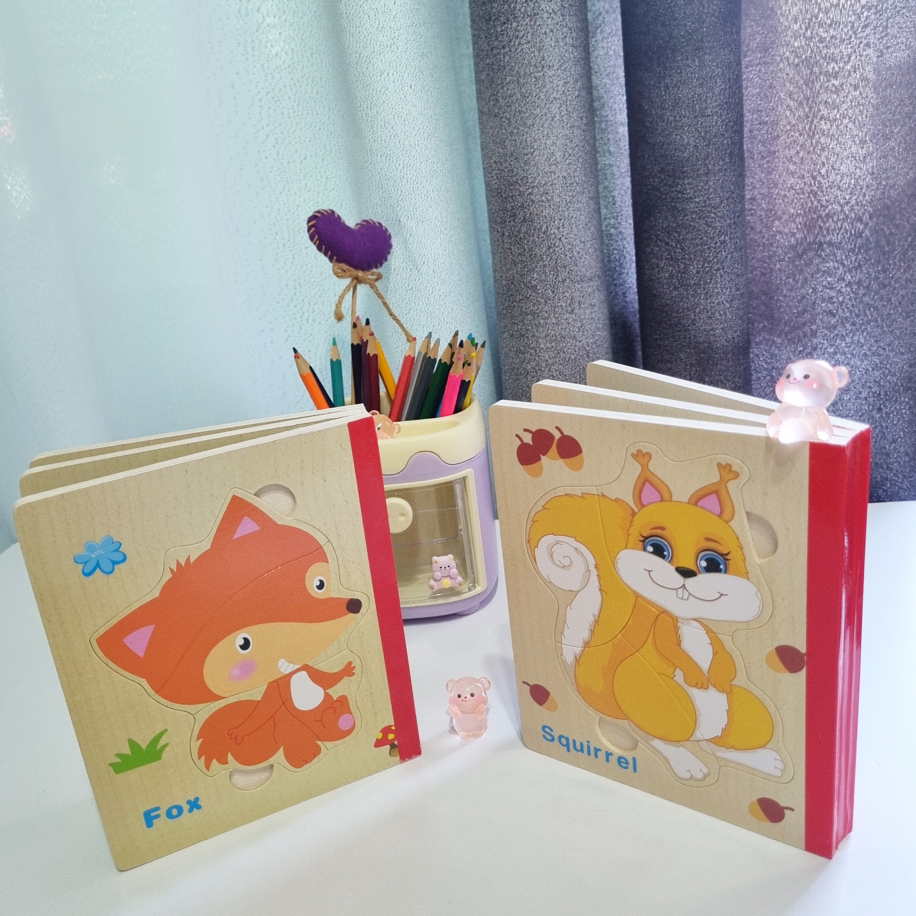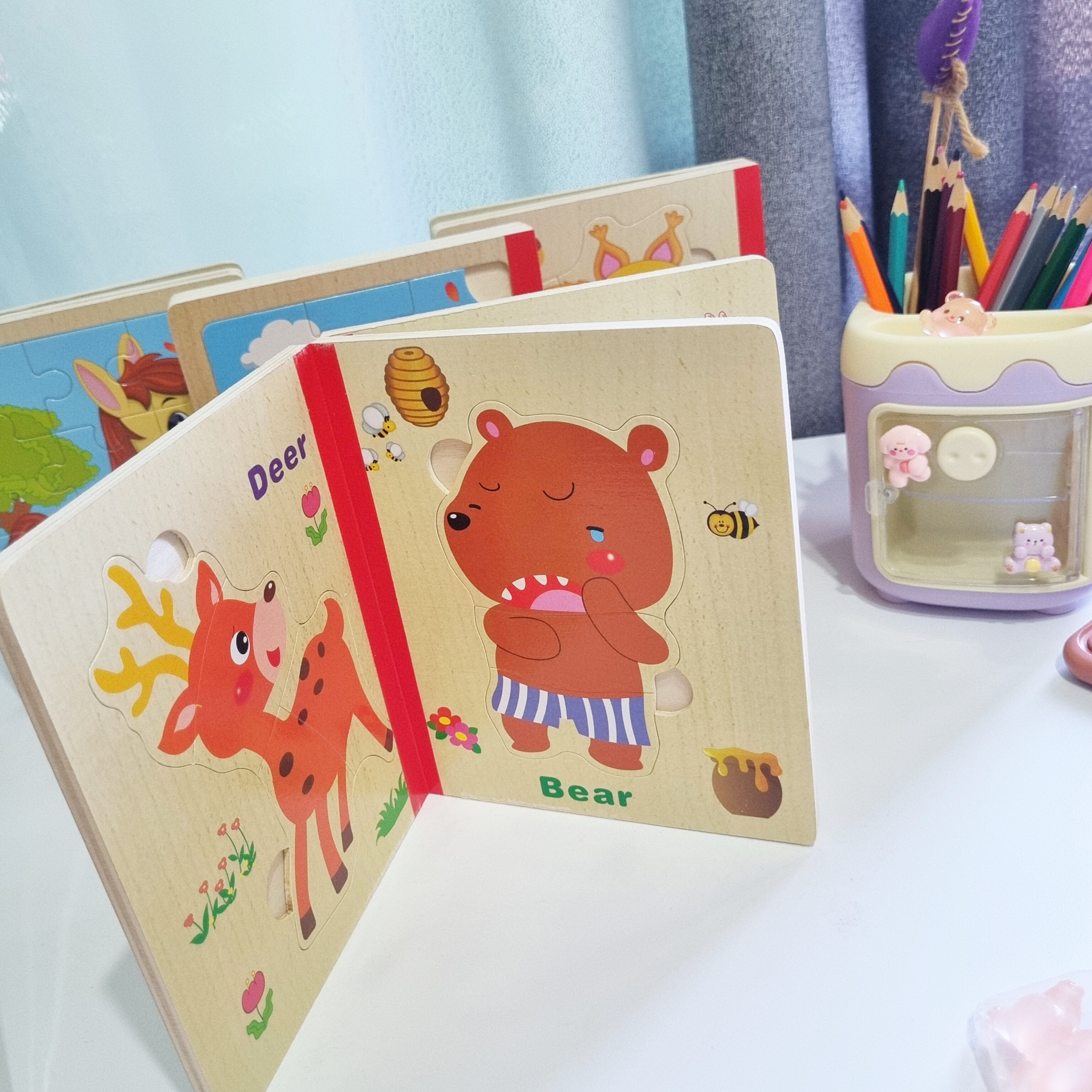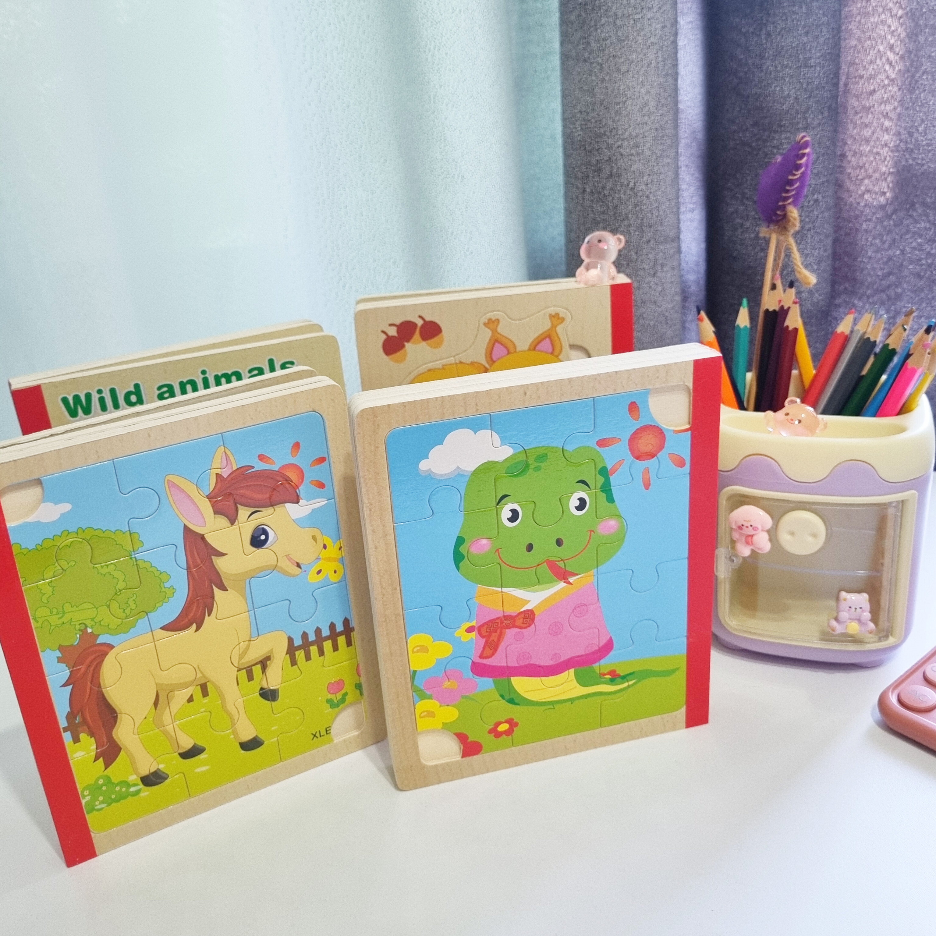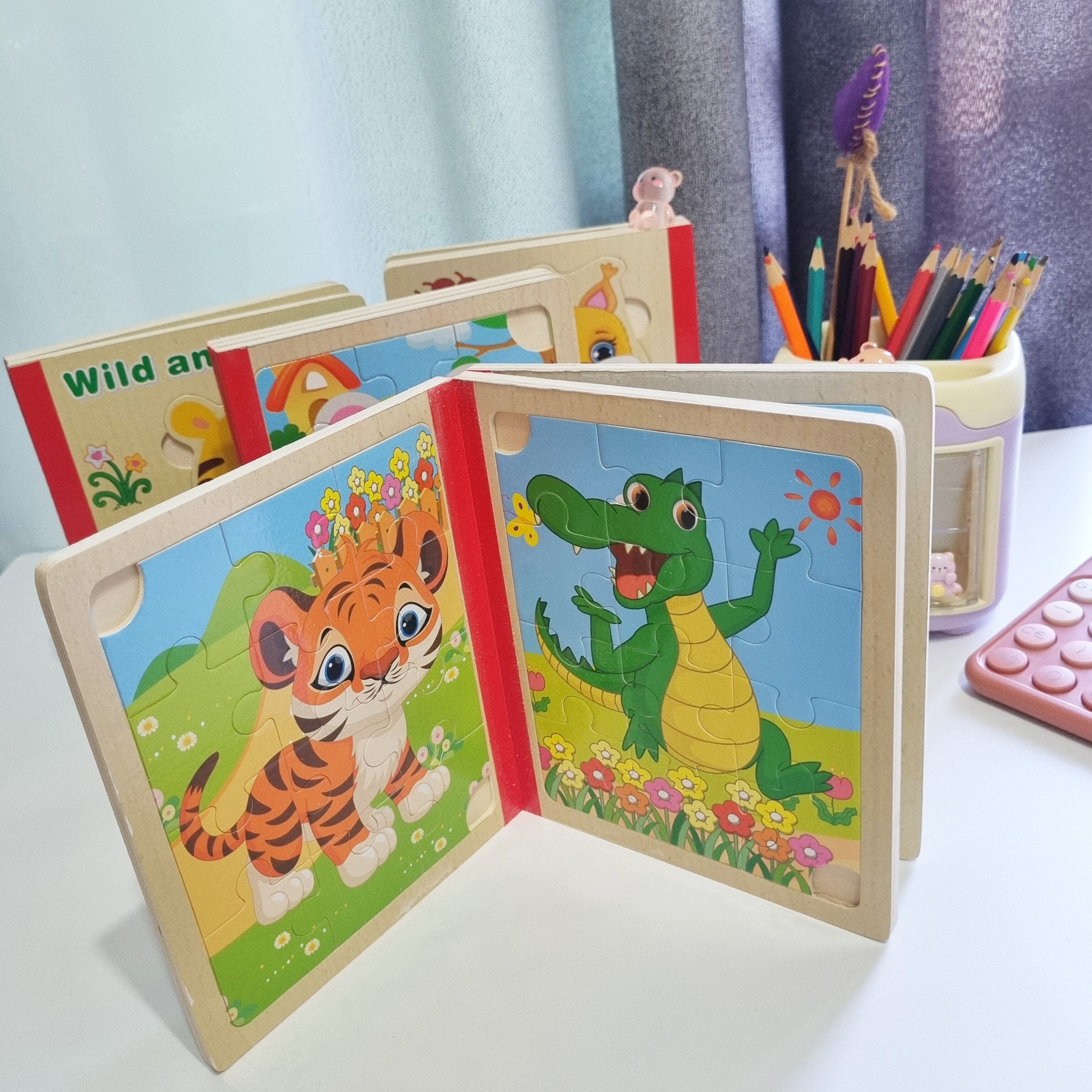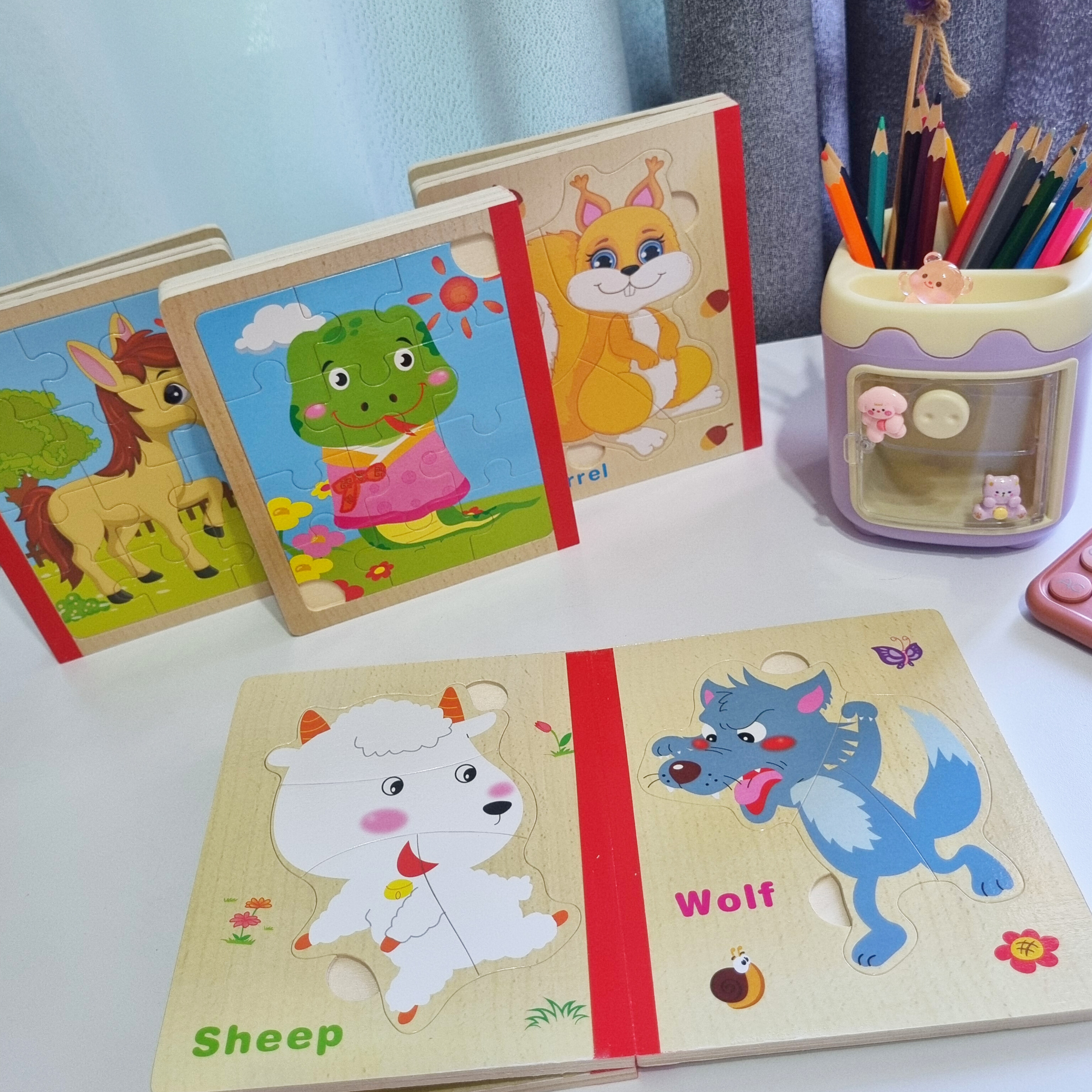 پازل چوبی کتابی از سه ورق چوبی است که جمعا 6 پازل را در خود جای داده است تشکیل شده است. کودک کتاب را ورق می زند قطعات پازل را کنار هم می چیند و از روی تصاویر شروع به داستان پردازی می کند. یکی از فواید حل کردن این پازل های تقویت مهارت حل مساله و پرورش خلاقیت در کودکان است . صفحات این کتاب ضخیم و مقاوم است