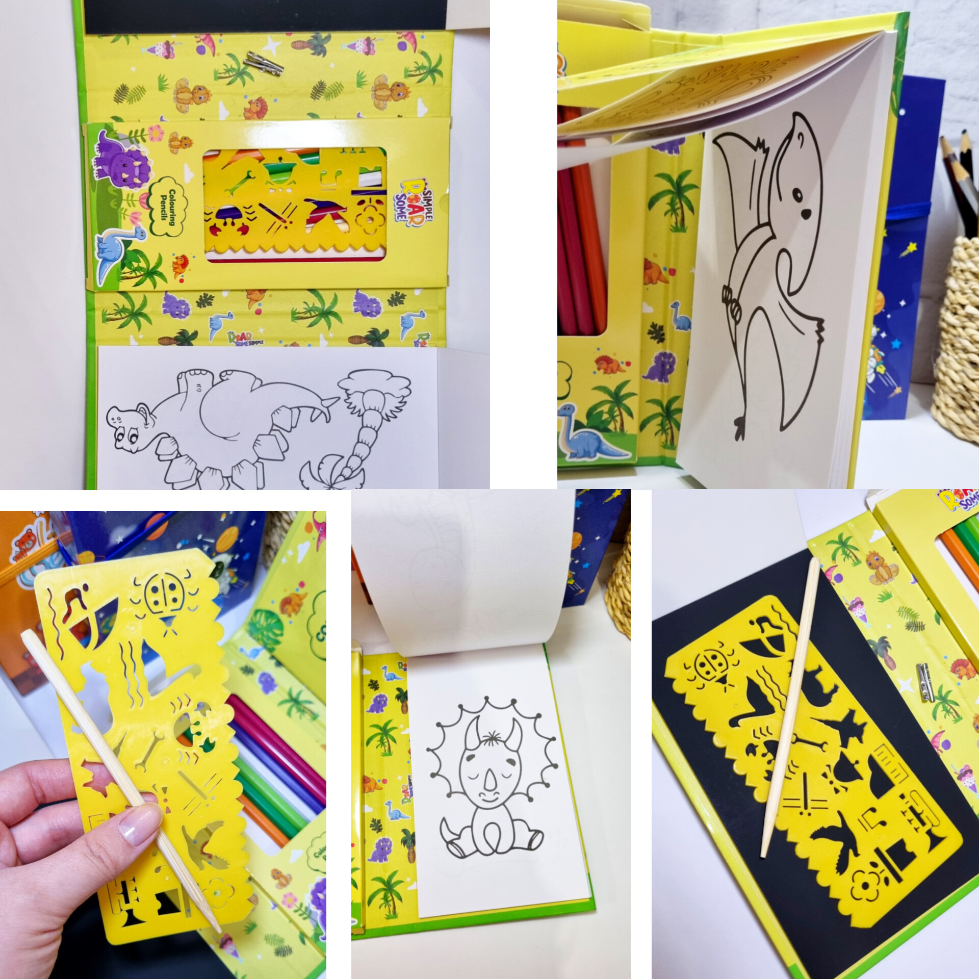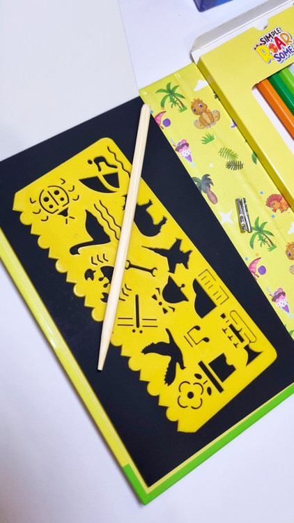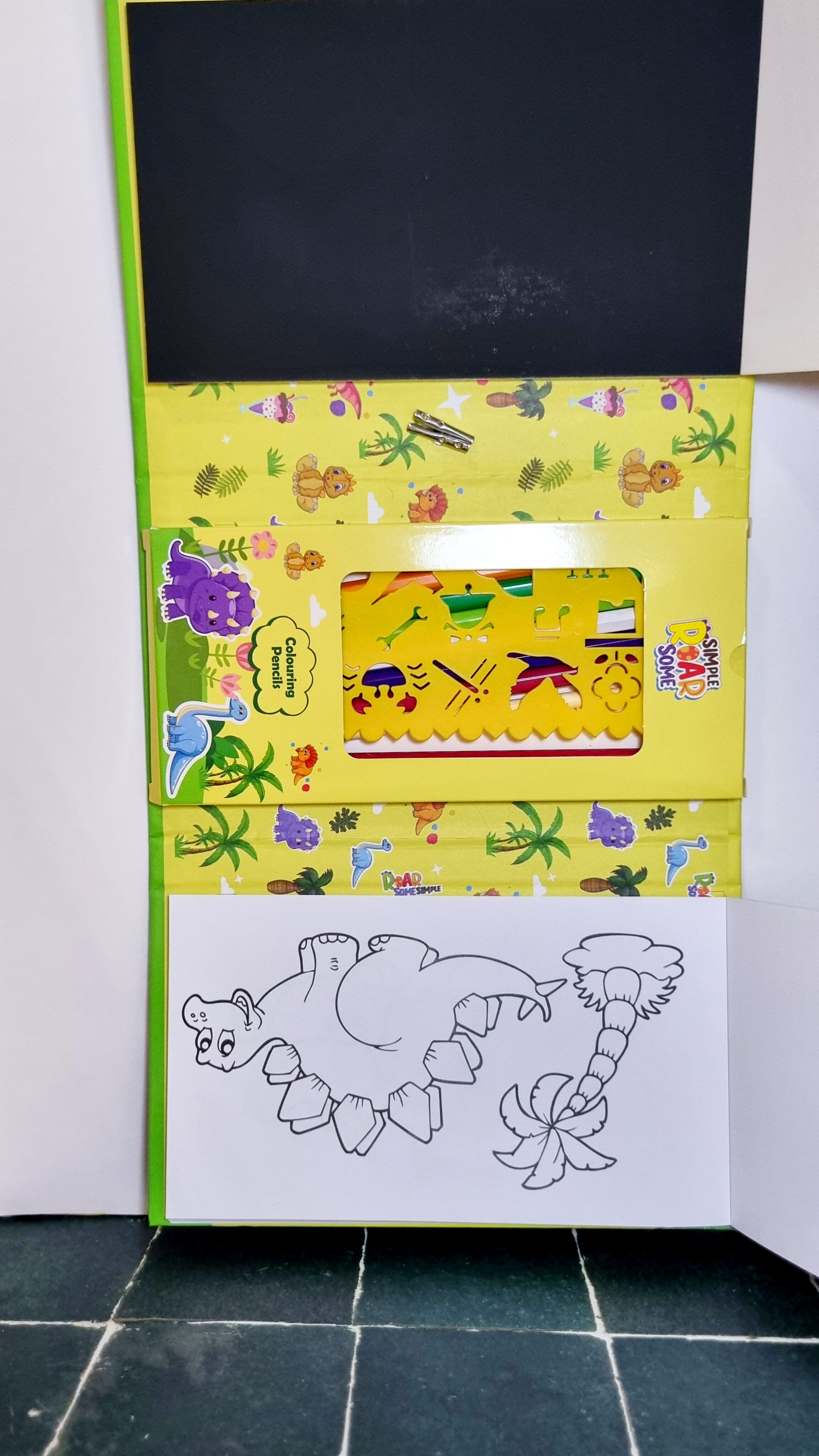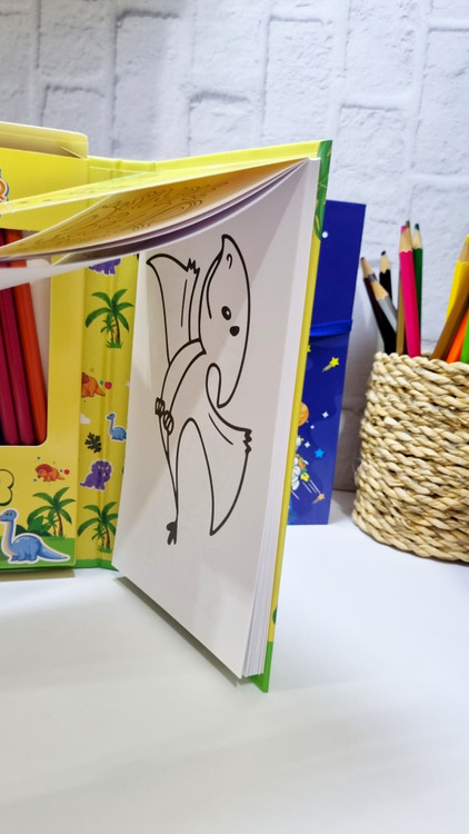 دفتر از 3 قسمت تشکیل شده که ی قسمتش رنگ آمیزی داره ی قسمتش دفتر نقاشی ذغالی و ی قسمتش مداد رنگی و شابلون نقاشی